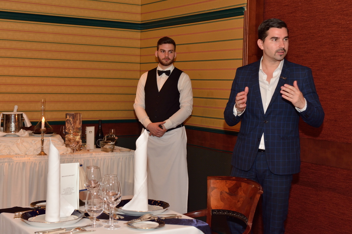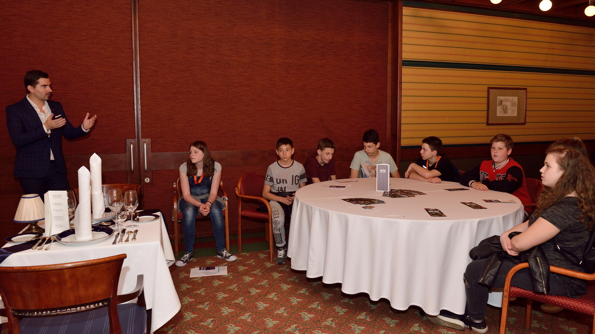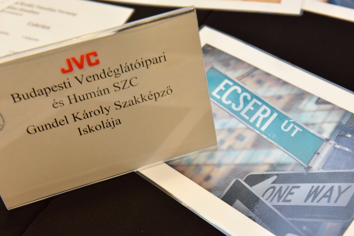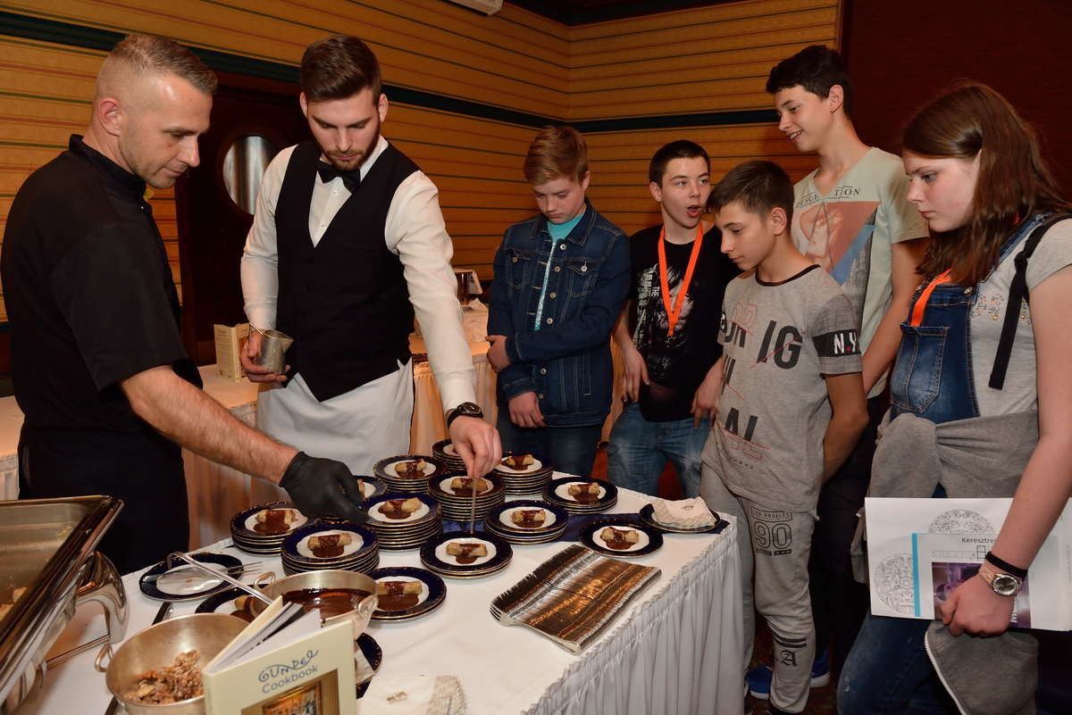 A Gundel Étterem jellegzetes aranyozott porcelánjaival mutatkozott be a helyszínen. Ha a borokba nem is, de a borfelszolgálás alapismereteibe mindenképp belekóstolhattak a fiatalok, mindent megtudtak a dekantálásról, majd sorra kerültek elő a telefonok, hogy fotókon is megörökítsék a flambírozott Gundel-palacsintát.