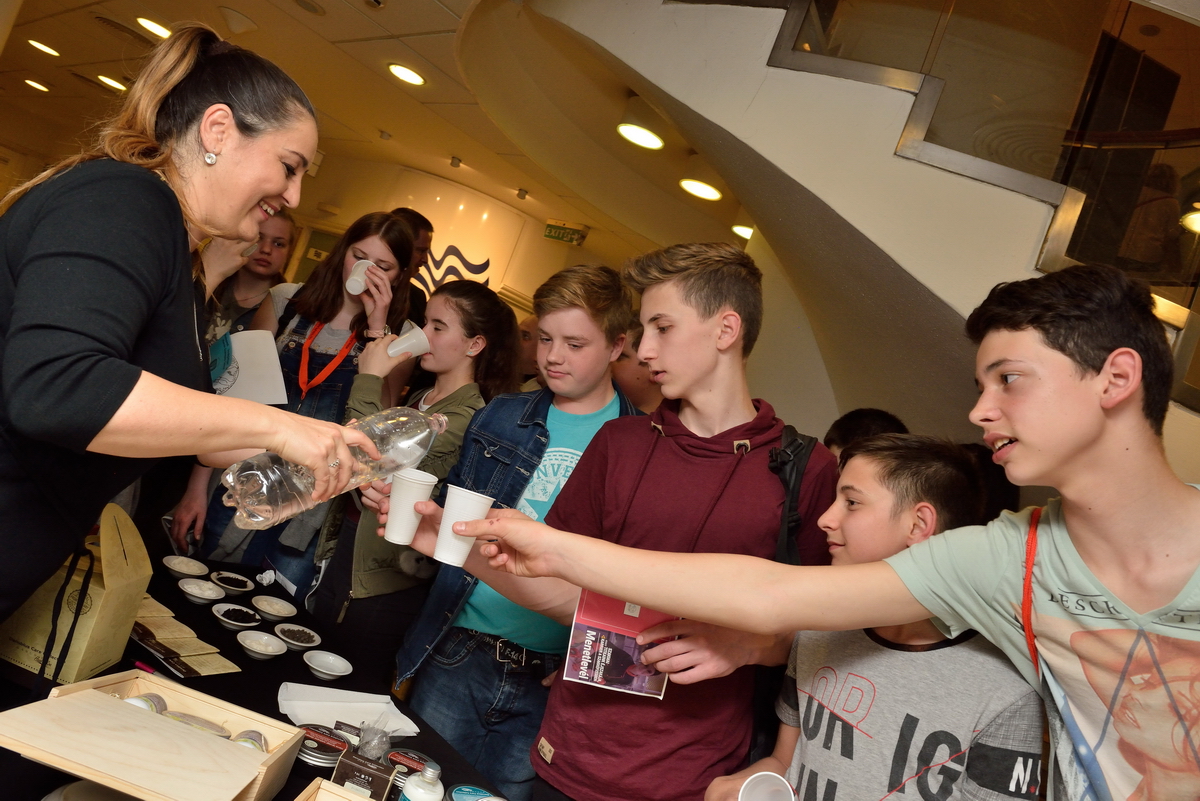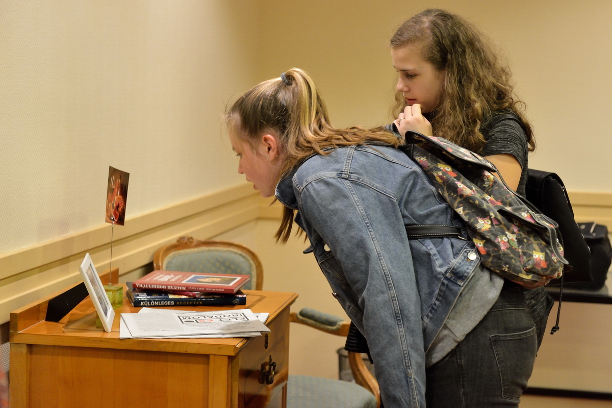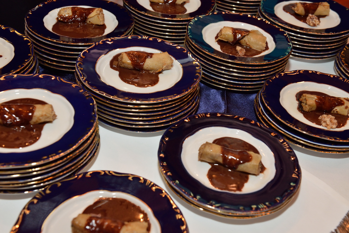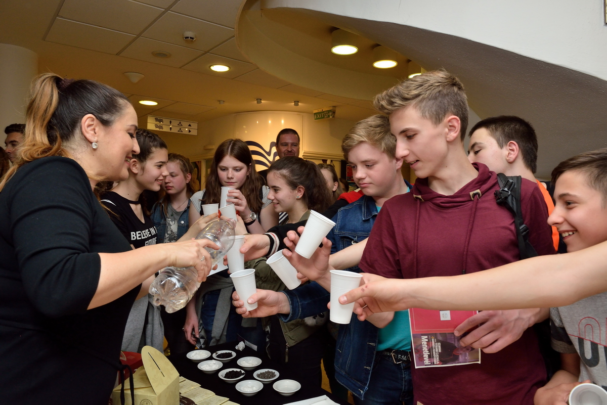 A Gundel Étterem jellegzetes aranyozott porcelánjaival mutatkozott be a helyszínen. Ha a borokba nem is, de a borfelszolgálás alapismereteibe mindenképp belekóstolhattak a fiatalok, mindent megtudtak a dekantálásról, majd sorra kerültek elő a telefonok, hogy fotókon is megörökítsék a flambírozott Gundel-palacsintát.
