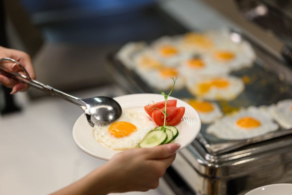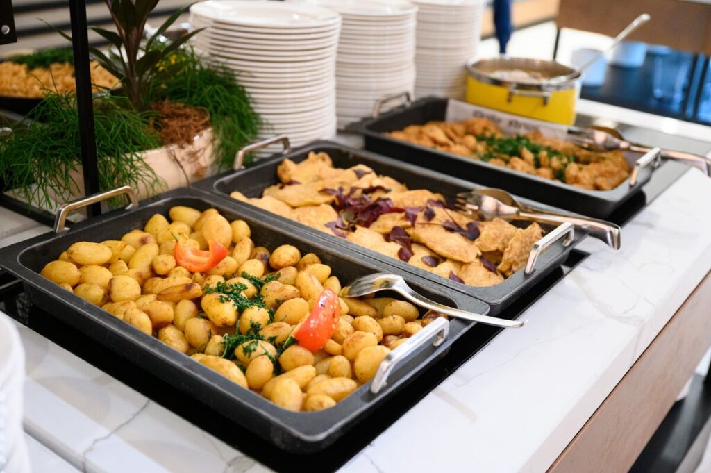 Mit is találunk a szállodai büféreggeli alkalmával a kínálatban? Meleg ételeket – tojást, bacont, virslit, sült kolbászt, bundáskenyeret szinte mindenhol, de párolt zöldségek, lecsó, paradicsomos bab is gyakran a büfé része, ahogy a gyerekekre tejbedarával, az egészségtudatosakra zabkásával gondolnak. Felvágottak, sajtok, körözött és túrófélék, zöldségek, gyümölcsök, kevert saláták, joghurtok, szardínia, olajos magok, aszalt gyümölcsök, finompékárú is gazdagítja a kínálatot, sőt kenyerek, stanglik, magos és hagyományos kiflik és zsemlék, kakaós és foszlós kalácsok ínycsiklandozó bősége is elérhető. Az italok között is megtaláljuk a hideg gyümölcsleveket és a meleg italokat, amelyek most már leggyakrabban az automatából egy gombnyomásra választhatók. Természetesen a tej a hideg is és meleg is lehet a szállodai büféreggeli alkalmával, és gondolnak az allergiával élőkre is, laktózmentes növényi tejek, gluténmentes kínálat formájában. A legelegánsabb helyeken a narancslé frissen facsart, és a vendég kérésére készítik el frissen a tojásételt, az asztalon elhelyezett kis étlap alapján.
