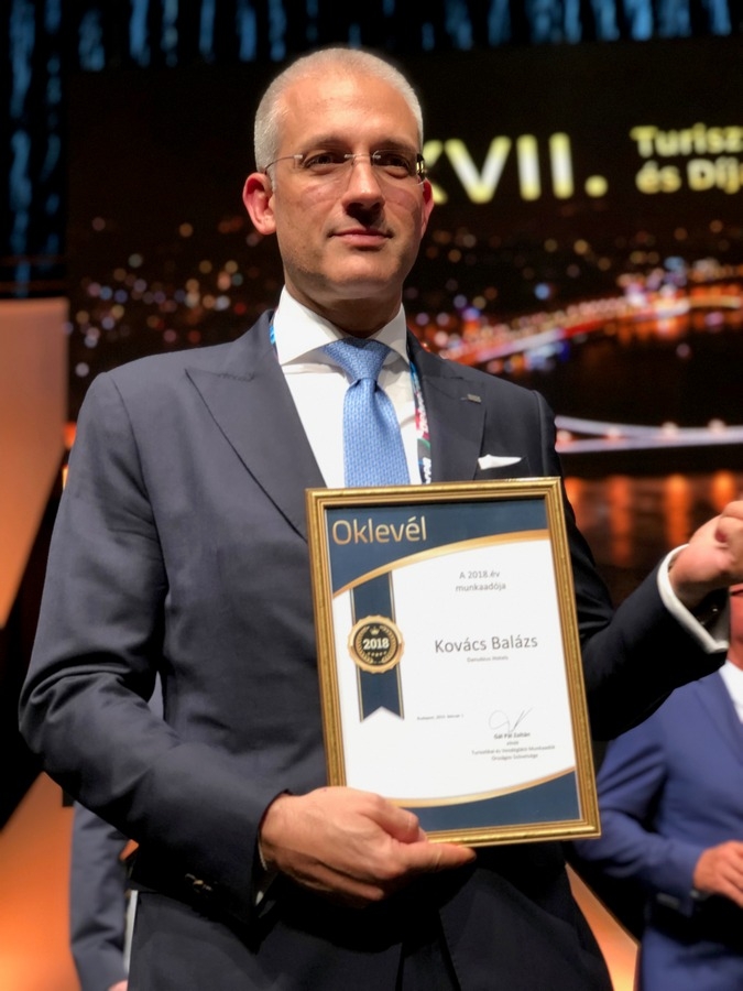 Kovács Balázst, a Danubius Hotels Group vezérigazgatóját „Az Év Munkaadója” elismeréssel jutalmazta a VIMOSZ ezévi turisztikai évadindító Gáláján. A szállodalánc vezetőjének a díj azt is jelenti, hogy a Danubius Hotels Group-nál dolgoznak az év munkavállalói.