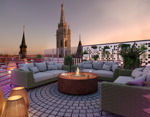 A 3D-s kerámia mozaikok a Mátyás-templom Zsolnay csempéinek kistestvérei. A bár italtartóként szolgáló hátfala pedig a templom ólomüveg ablakaira utal vissza. Az asztalok és székek elrendezése úgy van megtervezve, hogy bárhova is ül az ember, a kilátás nem marad rejtve előle. A kortárs bárpult szuper találkozópont ismeretleneknek is, de ha sokadmagával érkezik az ember, a nagyméretű lounge körasztalok körül már-már szeparálva, csoportosan is kényelmesen. Mindez Nathalie Rottenburg keze munkáját dicséri. A spanyol születésű, Braziliában felnőtt hoteldizájn-specialista 2015 óta dolgozik együtt a Danubius szállodalánccal és a bejáratott munkakapcsolat abszolút meggyőző: makulátlan, mégis élettel teli élmény.