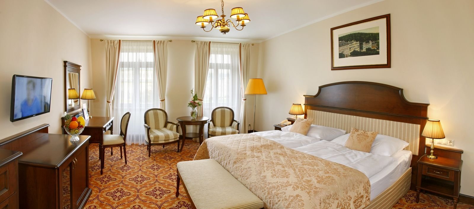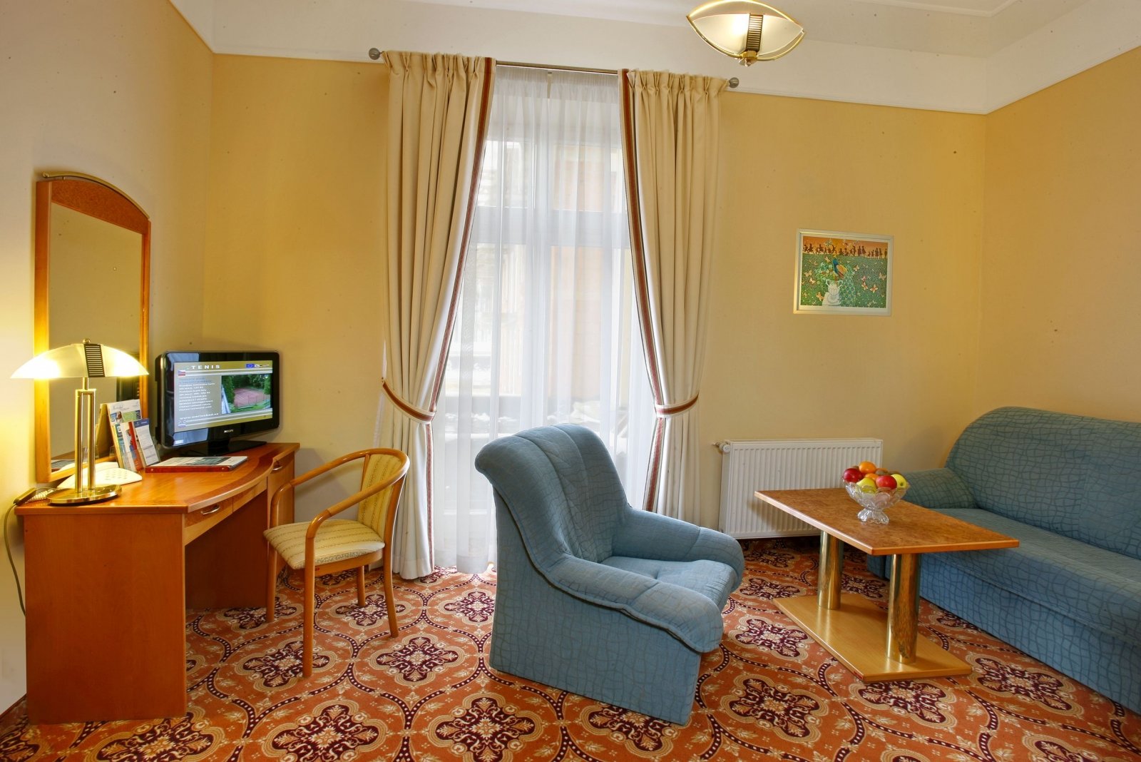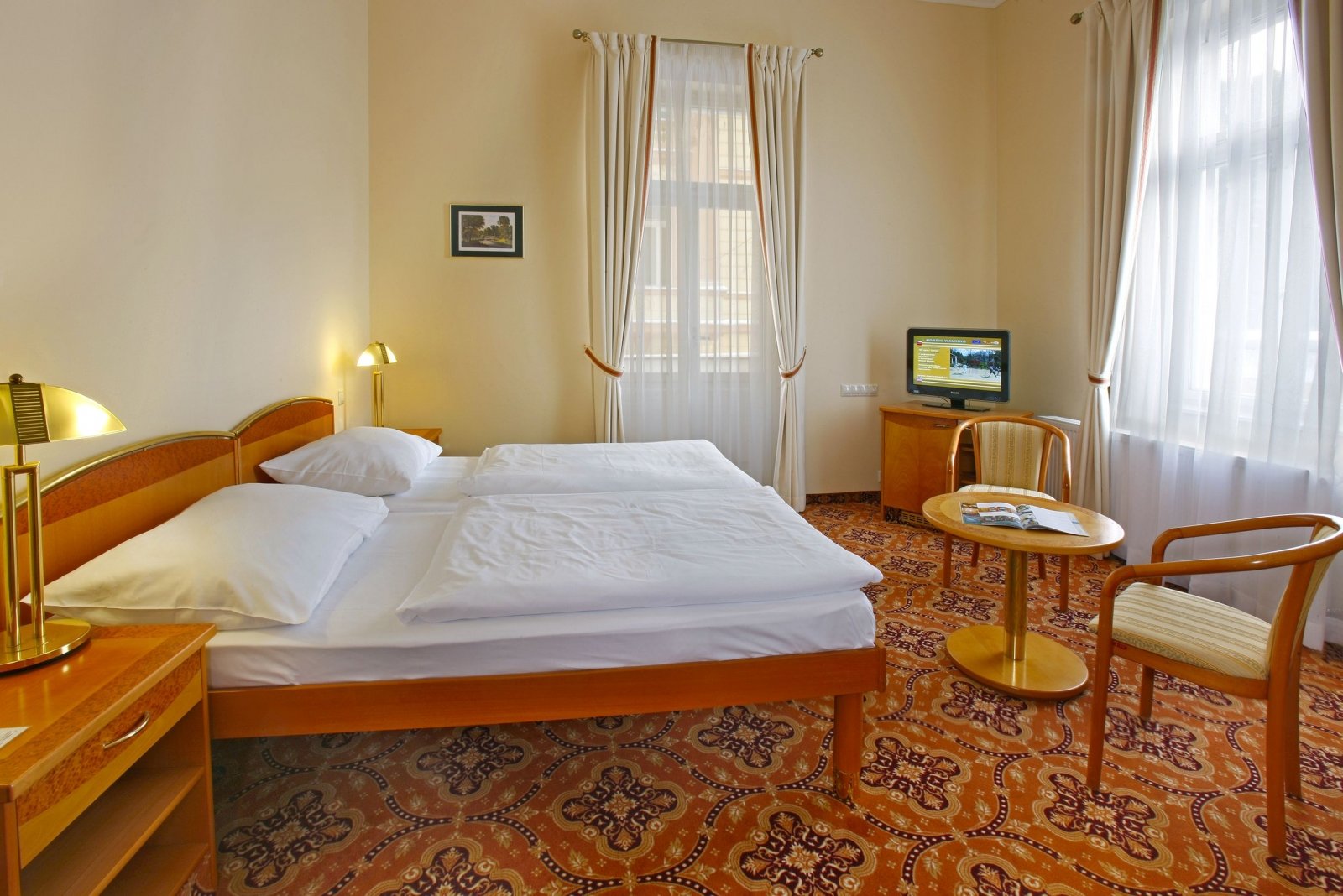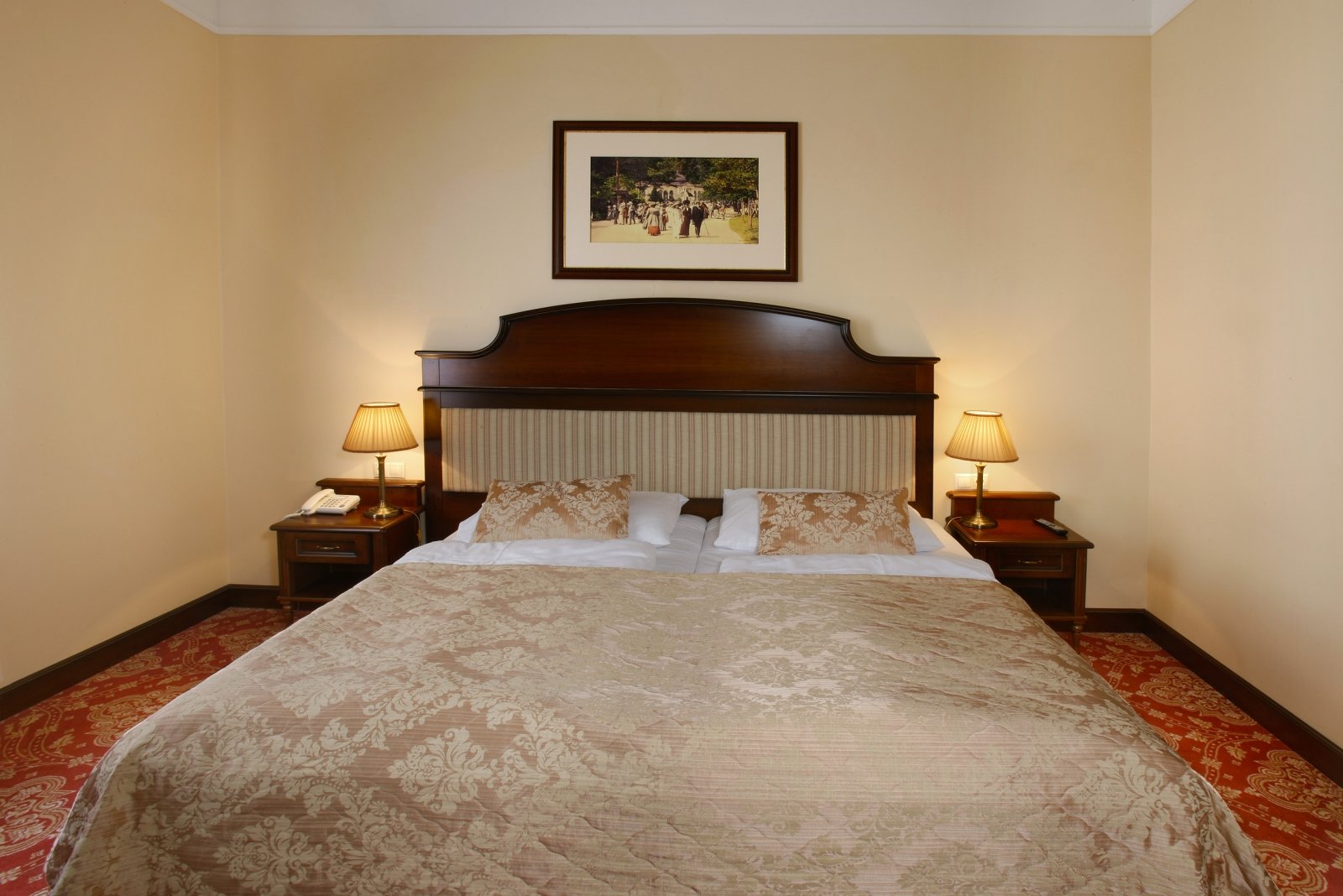 Marienbadi gyógyüdülőnk vendégei luxuskörülmények között ébredhetnek kényelmes, fejedelmi eleganciával berendezett szobáinkban, amelyek ablakai a környező, madárdaltól hangos parkra néznek. A legkorszerűbb kényelmi szolgáltatások és berendezések mellett az otthon kényelmét nyújtjuk Önnek a műholdas televíziótól a minibáron keresztül az internet-hozzáférésig.